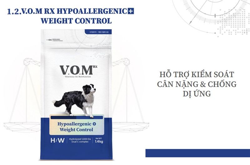 V.O.M Weightcoltrol: Hỗ trợ điều trị xương khớp, kiểm soát cân nặng, duy trì cơ bắp. Tăng cường tầng bảo vệ da lông được óng mượt và chống dị ứng thực phẩm ở chó