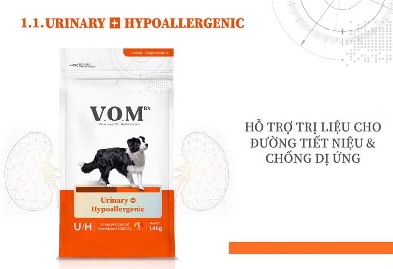 V.O.M Urinary hỗ trợ trị liệu về đường tiết niệu: Cung cấp Protein thủy phân cao cấp giúp giảm viên đường tiết niệu và chống oxy hóa. Tiêu trừ và ngăn ngừa sỏi tiết ở chó.